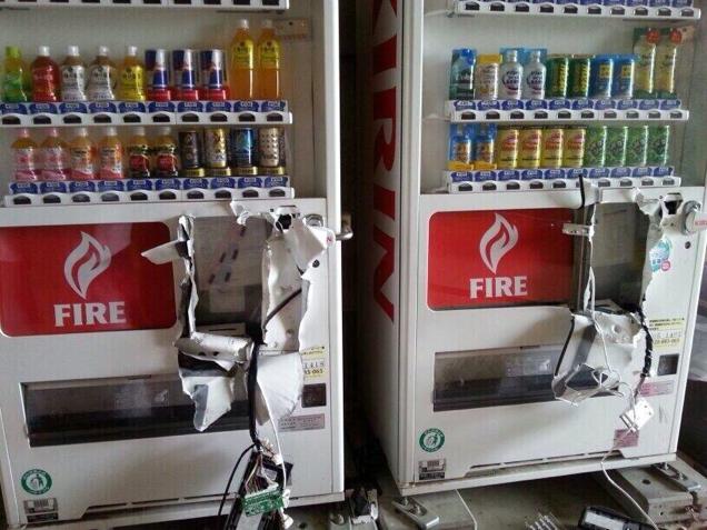 結構な衝撃的な絵なのですが、ニュースでは取り上げてなく、ツイッターの画像だけなのですが、、自販機に穴を開けるというのは、結構な技術がいると思うので、真相はどうなっているかはわかりません。
